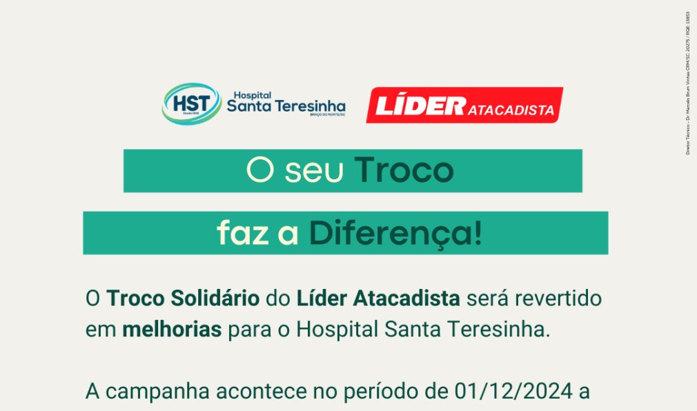 O Hospital Santa Teresinha, em parceria com a Rede de Supermercados Líder Atacadista, faz parte da campanha Troco Solidário.